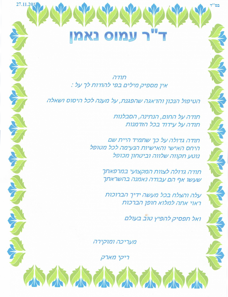 "ברצוני להודות לד"ר עמוס נאמן על הניתוח לתיקון הידרוצלה מצד ימין של בני בן ה6 שעבר בהצלחה רבה ברוך השם. ד"ר עמוס היה מאוד מקצועי,סבלני,עדין ,וכמובן מתחשב בצרכים של הילד וההורים.